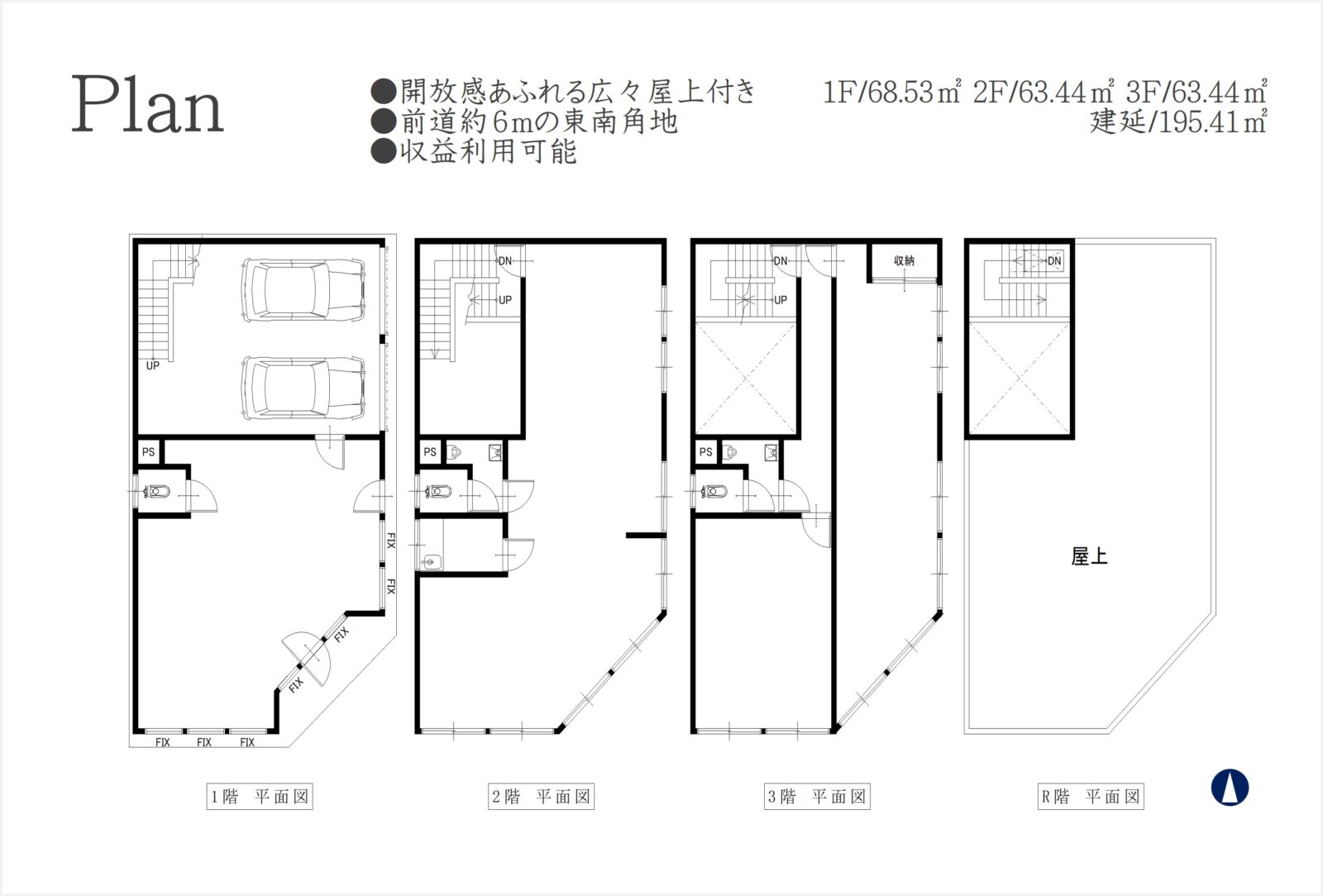 - 195.41㎡(1階68.53㎡・2階63.44㎡・3階63.44㎡)